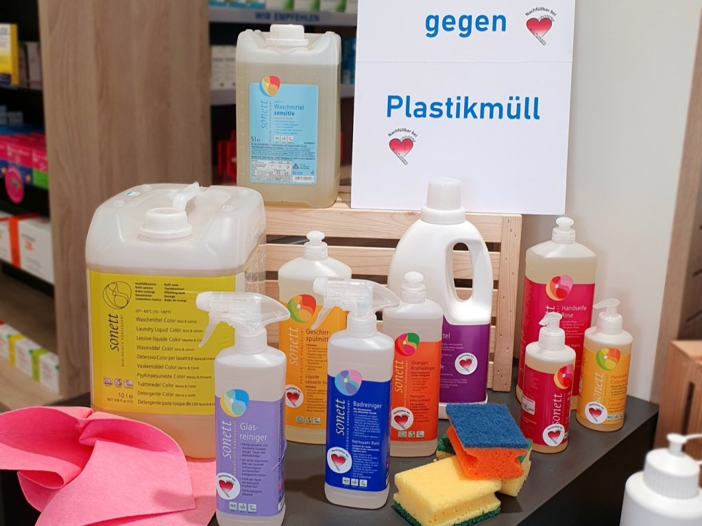 Der Umwelt zu liebe füllen wir viele Produkte nach. Dazu gehören Reinigungsmittel von Sonett und Duschmittel von Eduard Vogt.